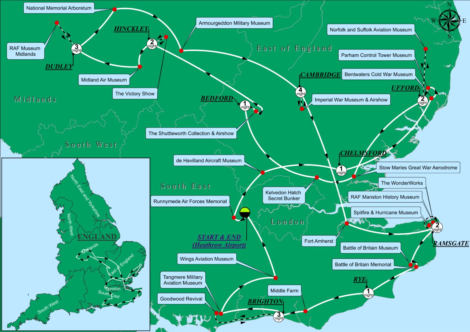 Runnymede Air Force Memorial - de Havilland Museum – Bentwaters Cold War Museum - Parham Control Tower Museum – Stow Maries Great War Aerodrome - Kelvedon Hatch Secret Nuclear Bunker – Midland Air Museum – RAF Museum Cosford - National Memorial Arboretum – Armourgeddon Military Museum - Imperial War Museum Duxford - Fort Amherst – Spitfire & Hurricane Museum – RAF Manston History Museum - The Wonder Works - Battle of Britain Museum - Battle of Britain Memorial - Tangmere Military Museum - Wings Museum